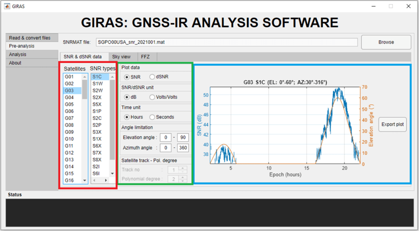 The second main module is “Pre-analysis” which has three submodules: (1) SNR & dSNR data, (2) Sky view, (3) FFZ. Here, the user can plot the SNR and dSNR data for different polynomial degrees for each satellite and signal type. The sky view can be plotted as including the selected satellite systems. The first Fresnel zones (FFZs) can be displayed on the plot screen and Google Earth. The user also can export all graphs as MATLAB figures.