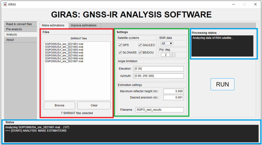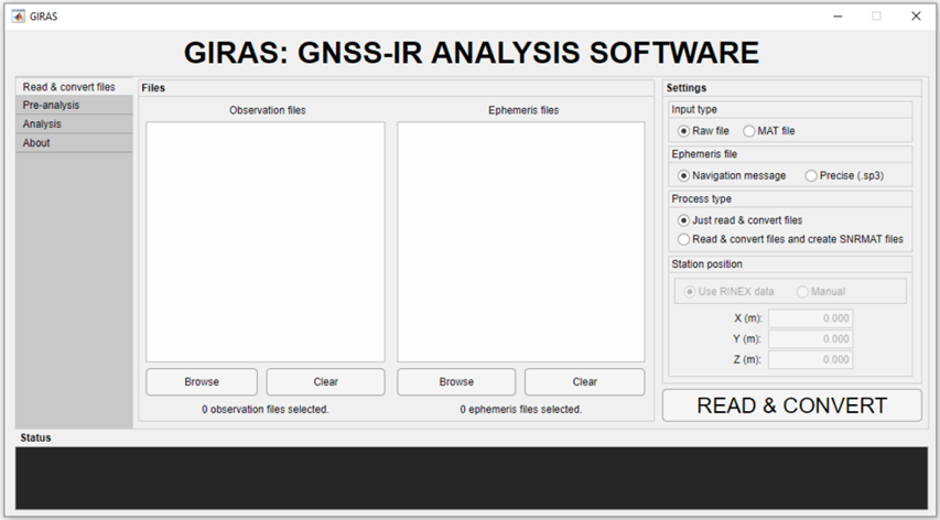 Newly, a MATLAB-based, open-source GNSS-IR analysis software (GIRAS), developed by Cemali Altuntas and Nursu Tunalioglu from Yildiz Technical University, Turkey, has been published online in GPS Solutions. With its graphical user interface and capabilities, GIRAS is a good alternative to existing software packages and tools. GIRAS has three main modules and five sub-modules. The first main module is “Read & convert files”. This module reads raw GNSS data and stores the necessary observations in the MATLAB environment. RINEX version 2 and RINEX version 3 observation files are supported. Both broadcast ephemeris and precise ephemeris (sp3) files can be used. Multi-GNSS (GPS, GLONASS, Galileo, Beidou) sp3 files are supported.